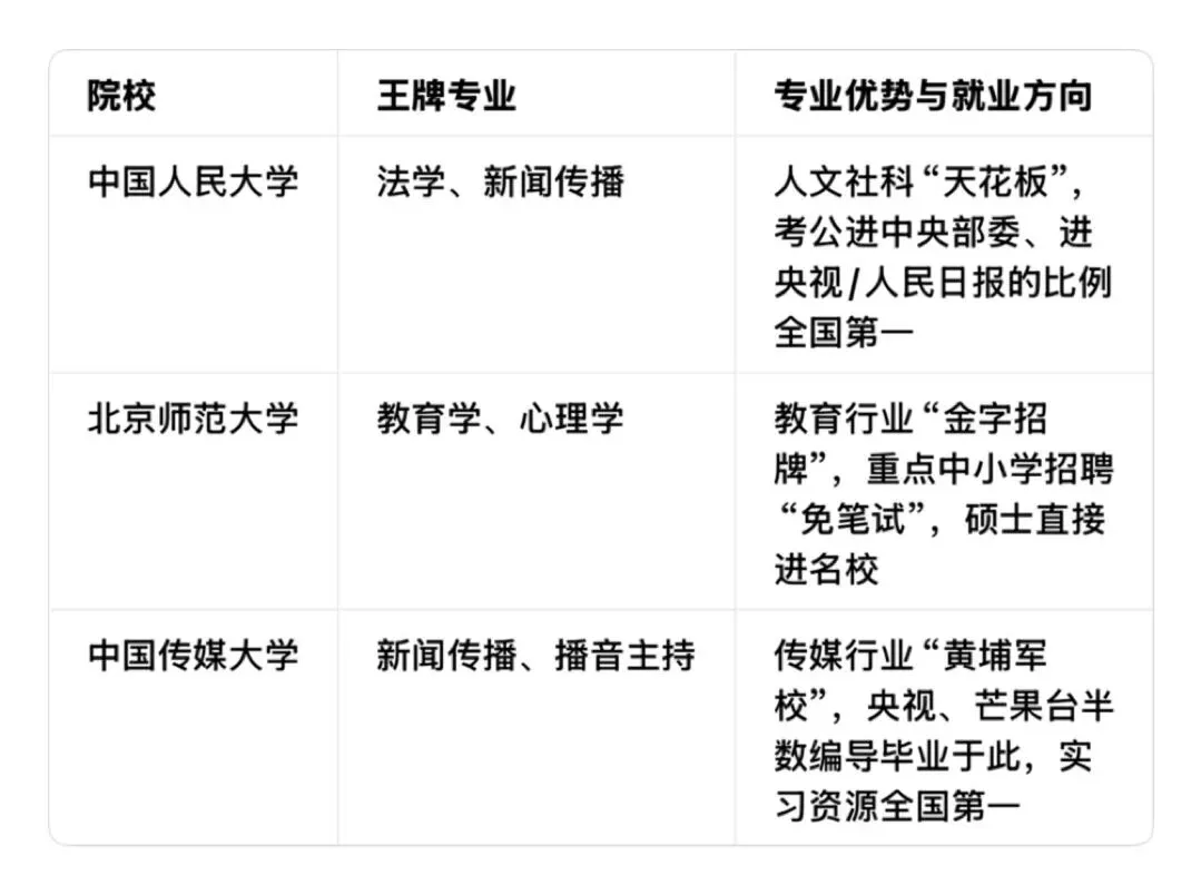 2. 文科看行业资源:新闻传播选传媒强校,法学选“五院四系”,教育学选师范类,比综合类985更实用;