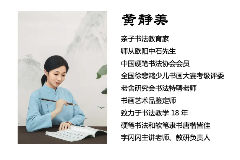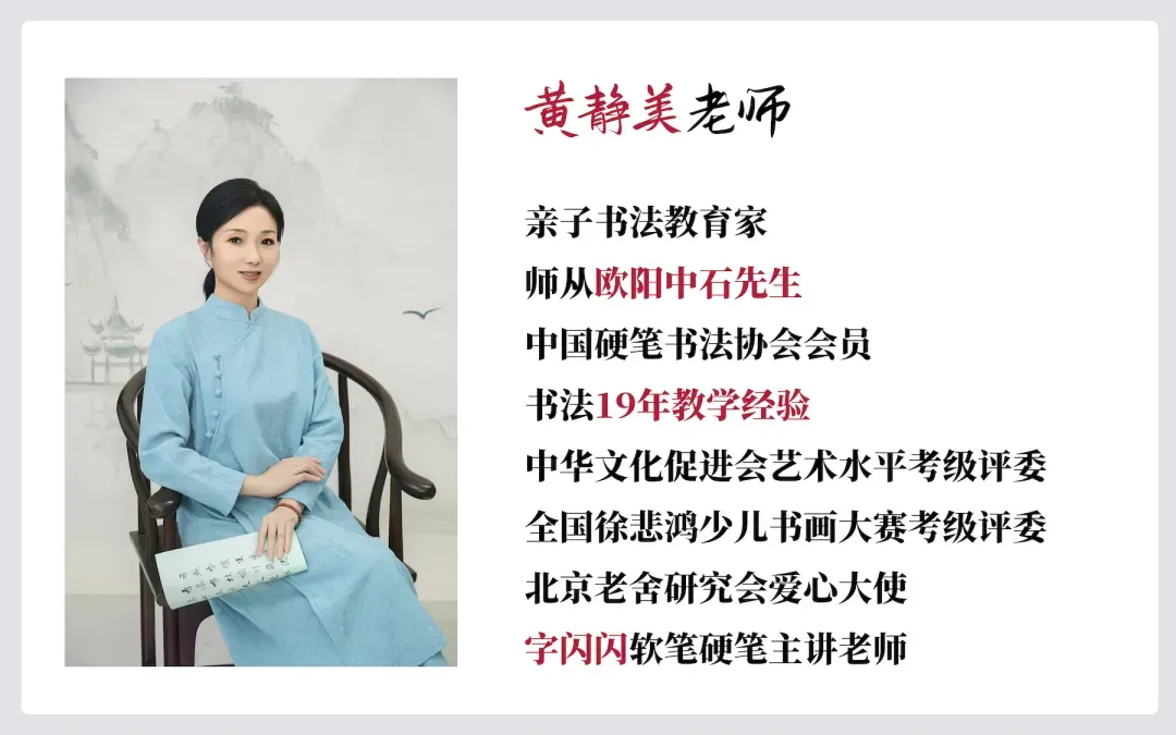 主讲黄静美老师,可不是普通学校里的老师,而是书法名*家,师从欧阳中石先生;同时也是有着19年一线教学经验的书法教育名*家。