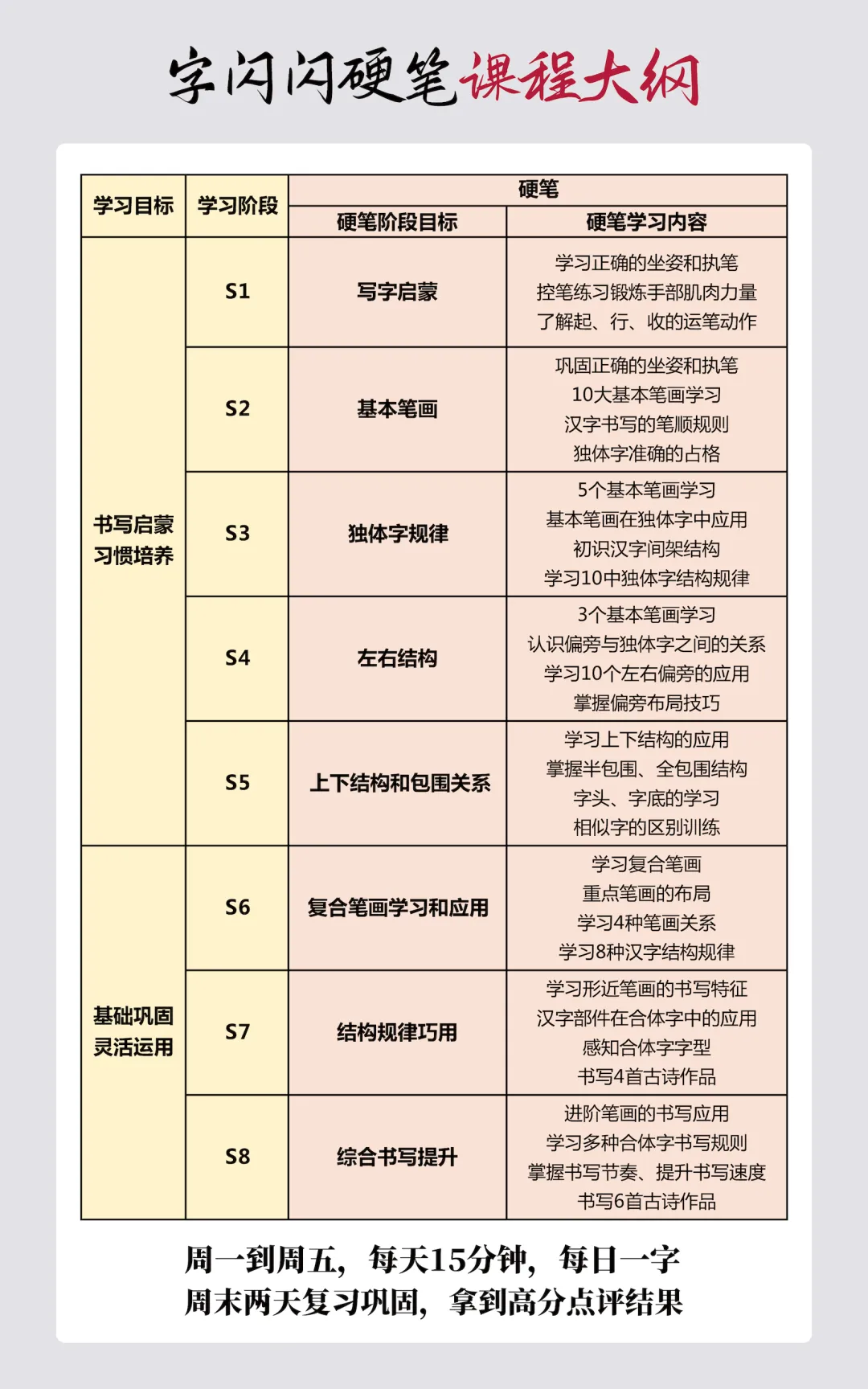 从启蒙(文房四宝+握笔姿势+练字方法),到基础(31个笔画+7大重点结构),再到进阶(独立创作6个书法小品、古帖鉴赏等),难度、深度层层递进。