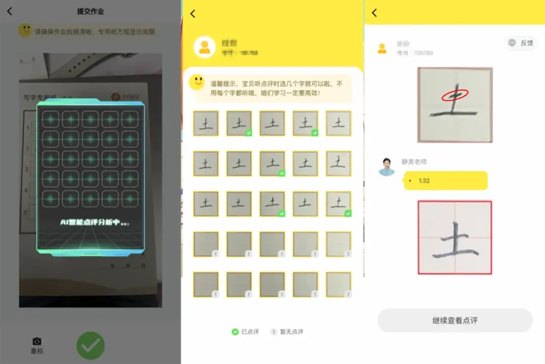 孩子用完给到我的反馈是,之前没注意到的小细节老师还都给指出来,而且每个字都能有点评,啥时候写完啥时候就能评。