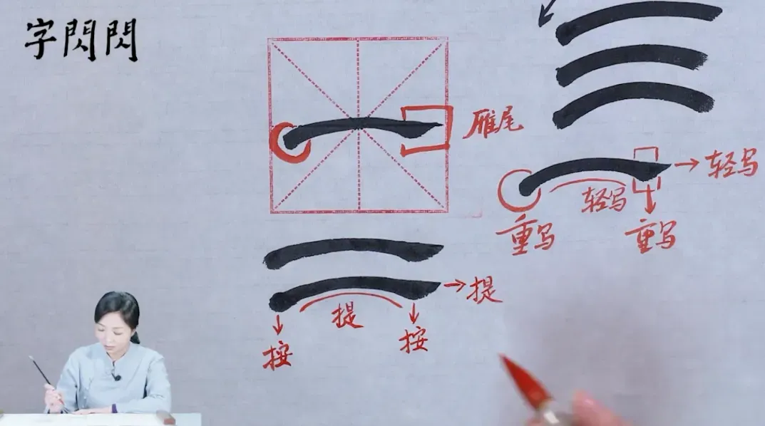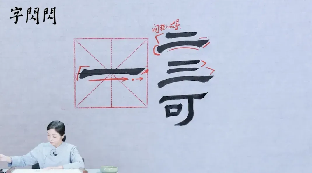 静美老师会从起笔顿笔、笔画顺序讲到笔画之间的间距、字形结构的安排,边讲边演示: