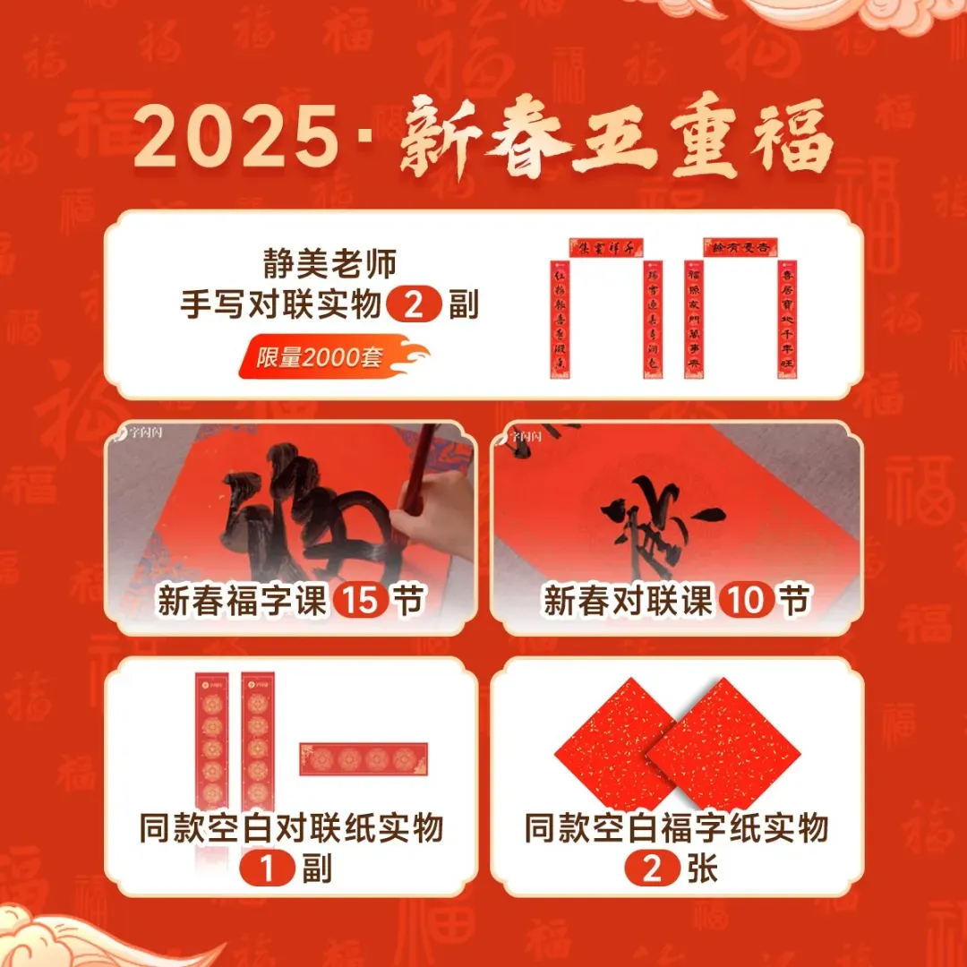 软笔礼盒和硬笔礼盒一起送,所有课程永久有效,硬笔点评不限次数。下单,还送总共价值3268元的赠品和新春5重福礼包: