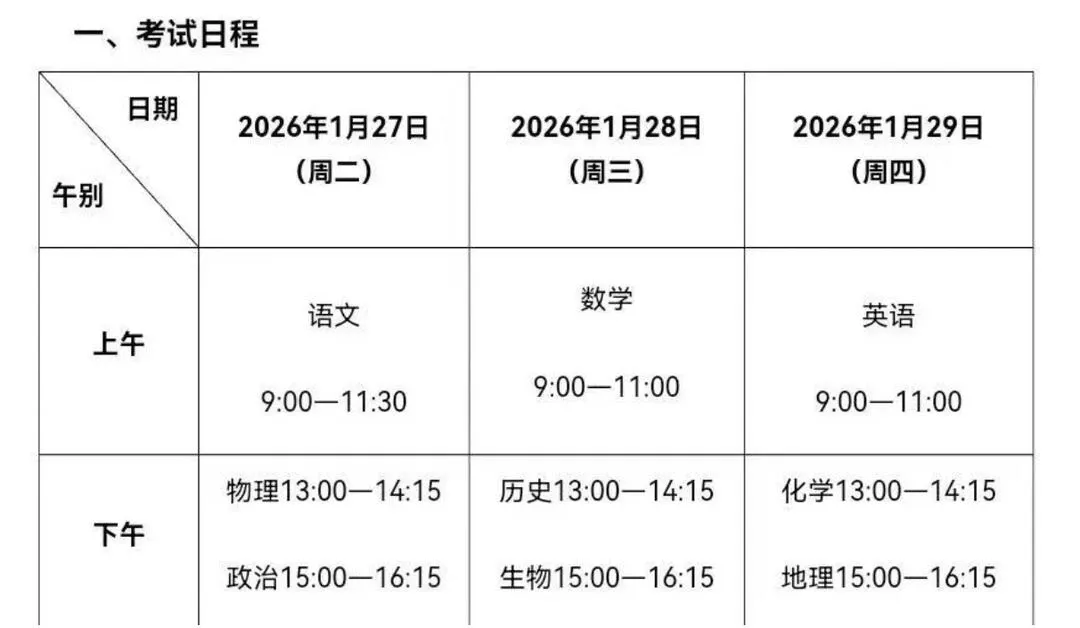初一年级:1月27日-28日,各区统考;