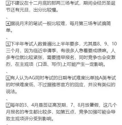 对中国考生而言,每年最长的两个假期就是“十一”和春节,如果同学们并不打算在这种长假期坚持每天固定一段时间学习雅思,那么不建议你直接报名假期后的第一、二场考试,那时你自己的“假期综合症”都还没调整过来,贸然上雅思考场可能会让两千多的报名费打水漂