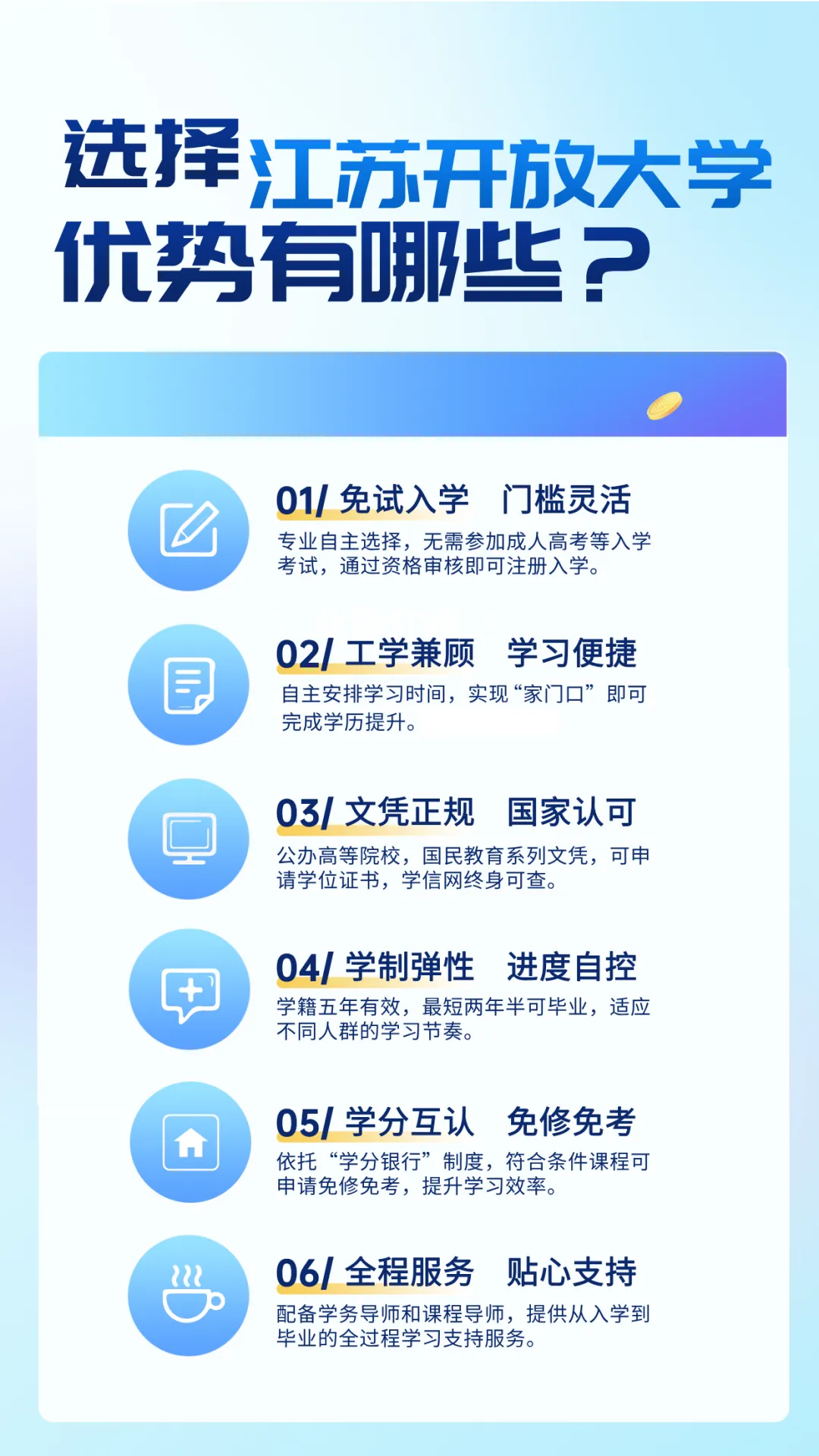 三、任何自称与“江苏开放大学”合作,宣称“不用考试”“不用学习”“作业有答案”“包过包学位”等虚假宣传以及跨学年收费、多收费、一次性收取全部学费的行为均与江苏开放大学无关,且涉嫌违法。请广大求学者切勿轻信任何虚假违规宣传,以免上当受骗。