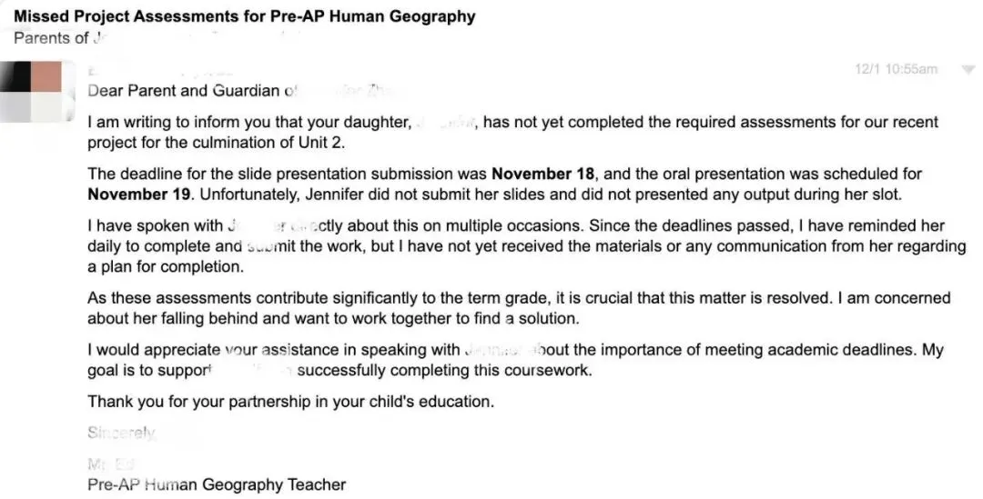 英美国家的学校一般要求GPA在3.2以上,但如果是新加坡、韩国这种高竞争的地区,说GPA越高越好也不为过。但很多家长把孩子送进学校,就撒手不管了,如果成绩出现了问题,就希望老师直接和孩子面谈。但孩子的成绩问题有时不只是个人学习习惯的问题,有时是需要改善的学习环境,家庭环境、亲子关系等等。任课老师会在不同节点和家长发信息,比如孩子有重大项目没有提交、一段时间连续不按时提交作业可能影响成绩时;在学期临近四分之一、一半(期中)的时候给家长发信,预警需要关注的地方。(社科老师给家长发送的关于学生多次未提及作业的提醒,抄送给我)我作为升学指导会定期查看学生成绩,也会要求任课老师给家长发邮件的时候抄送我,以及时和学生沟通;如果不是我个人可以解决的,我会求助高中部主任,有时甚至邀请家长来学校面谈,确保及时干预。如果家长、任课老师和升学指导之间没有形成信息闭环,成绩问题往往会被拖到“已经很难补救”的时候。三、关于AP / SAT / PSAT:不是考不考,而是“什么时候考”