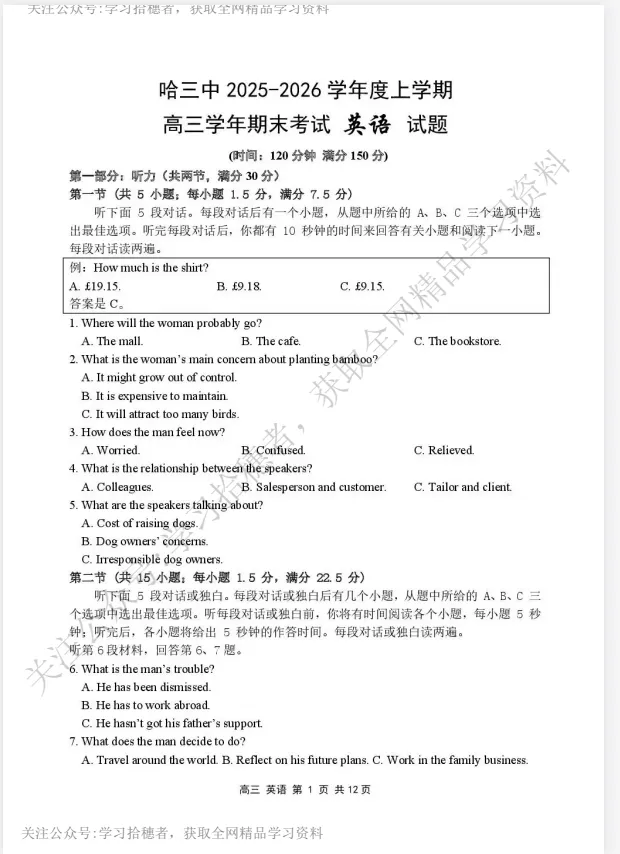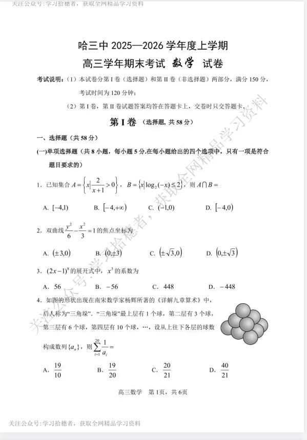 【黑龙江卷】【哈三中】【高三上学期期末考试】黑龙江省哈尔滨市第三中学校2026届高三上学期期末(1.8-1.9 开考)