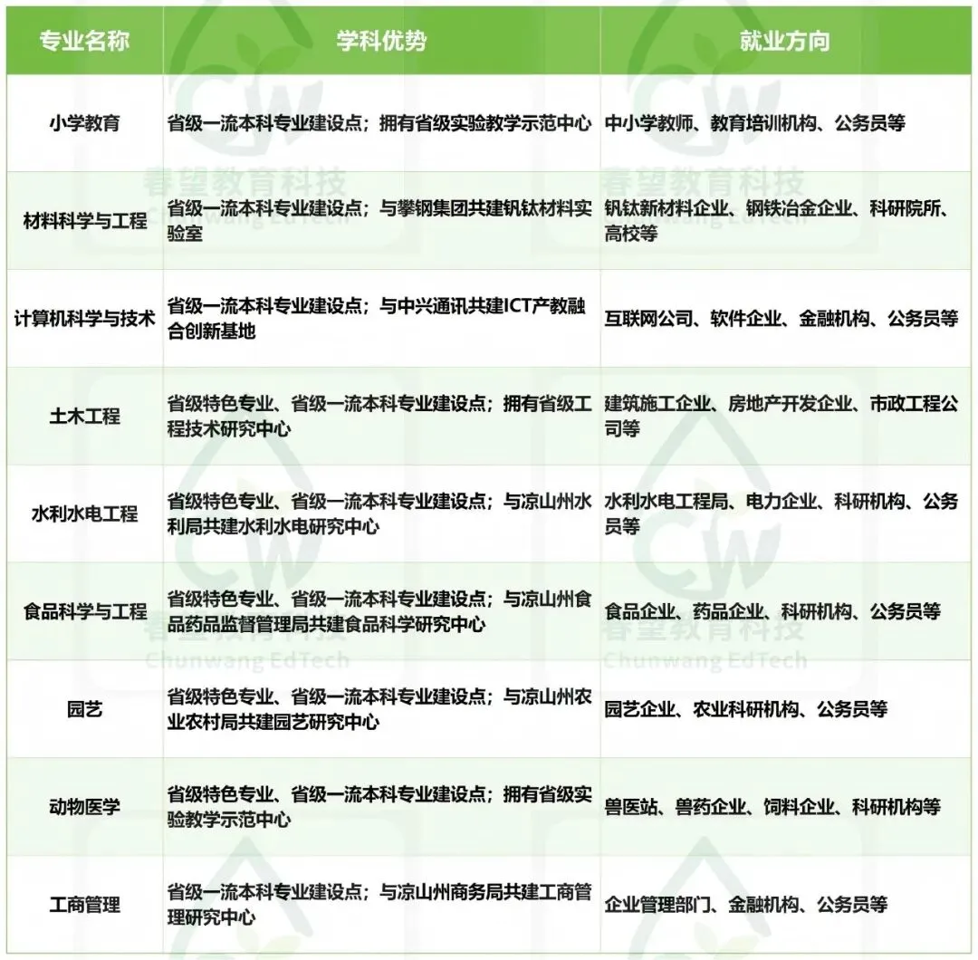 特色专业:中国少数民族语言文学、农学、动物科学等专业是学校的特色优势专业,与攀西地区产业发展需求紧密结合