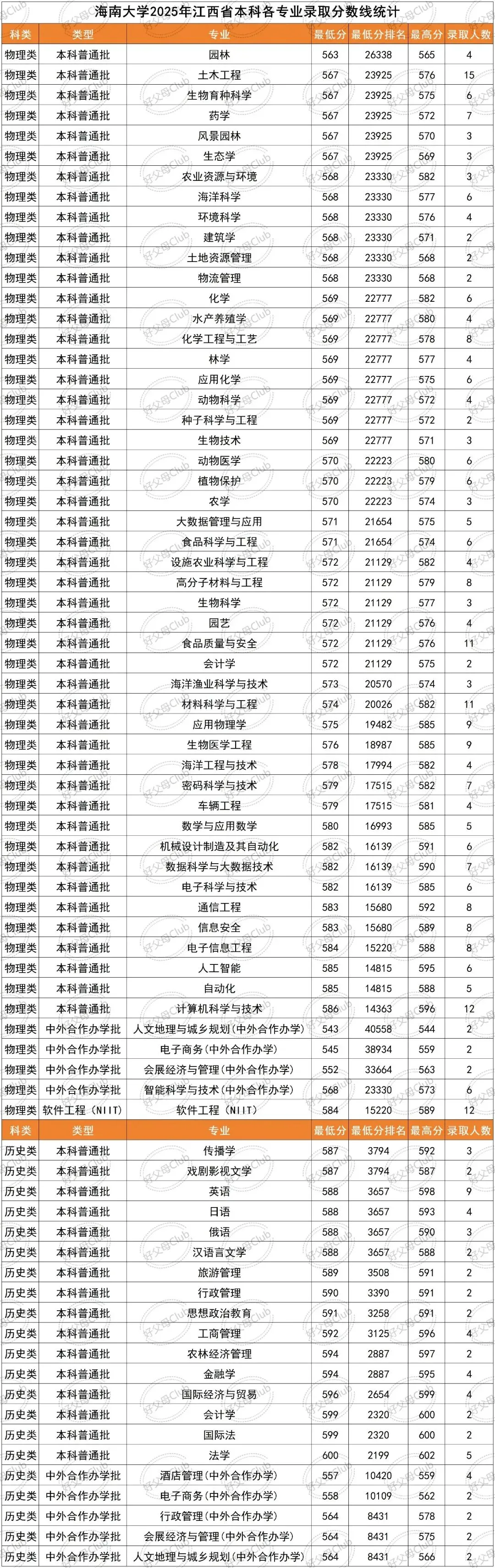 >海南大学2025年江西省本科各专业录取分数线