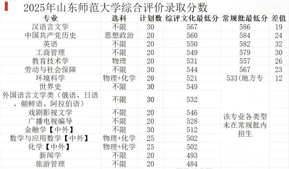 近几年来,山东大学综合评价招生的降分幅度呈现出持续下降的趋势,从前些年的降分20分,逐步调整至今年大致在上下10分的区间。具体来看,2025年降分情况中,预防医学专业降分达17分,经济学类与材料类专业的降分幅度则分别为11分,其余专业的降分基本都控制在10分以内。山东大学所采用的分组招生模式具备较高的科学性,同时,其综合评价招生的生源质量也呈现出稳步提升的良好态势。山东大学在招生专业的设置上展现出了十足的诚意,文科里面汉语言、法学、经济学、历史学。理科里面的材料、机械、能源、计算机、网络安全、临床都是目前的大热专业,同时大多数也是山大的头部专业。青岛科技大学综合评价招生的所有专业,均设置在普通类常规批次当中。从专业布局来看,无论是要求选考物理和化学的理科类专业,还是选考科目不限的文科类专业,都有一些颇具优势、值得关注的专业。在青岛科技大学的综合评价招生中,降分幅度最为显著的是两个重工科专业,其中金属材料专业降分达38分,功能材料专业降分31分。从青科的学科实力来看,其国家特色专业与省级特色专业大多集中在重工科领域,像化学工程、高分子材料与工程、材料物理、过程装备与控制工程等专业均在其列。因此,在一定程度上,高分子材料专业、过程装备专业以及化学专业,考生以510 - 520分的成绩就能被录取,性价比相当高。此外,该校的几个文科专业降分情况也较为可观,英语、工商管理、财务管理、编辑出版学等专业均有20分左右的降分。整体而言,该校各专业的降分幅度较为平稳且合理。汉语言文学、中国共产党历史、工商管理这三个专业,以及三个中外合作办学专业,均可被视为热门专业。此次山东师范大学综合评价招生的降分幅度较为平稳,平均降分约23分。该校的三个中外合作办学专业未在普通类批次招生,不过从相关数据来看,山东师范大学的财务管理(中外合作)专业录取分数为545分,物流管理(中外合作)专业录取分数为522分,这两个专业的分数均远高于其综合评价的录取分数,通过综合评价报考这两个专业,可实现约20分的降分。在热门专业中,汉语言文学专业的降分表现十分突出,取得了19分的降分。需要提醒考生和家长的是,新闻学专业虽然看似降分幅度较大,但它实际上属于“艺术类”专业,只有播音主持艺术统考成绩达到本科线的考生才有资格报考。