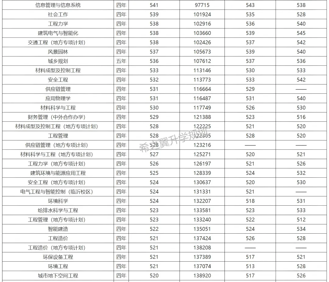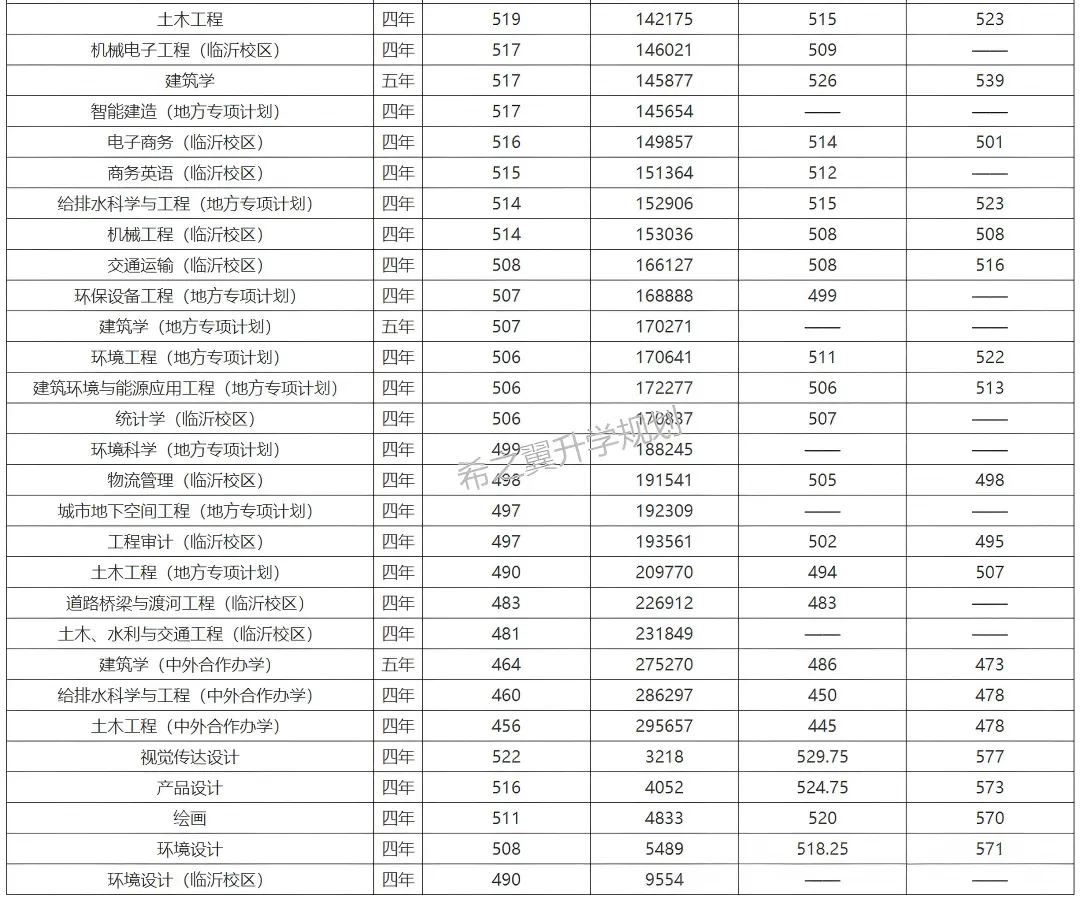 临沂校区普通类招生专业12个,录取分数最高的专业为会计学,录取最低分为543分,位次94981名;录取最低分专业为土木、水利与交通工程,录取最低分为481分,位次234230名。