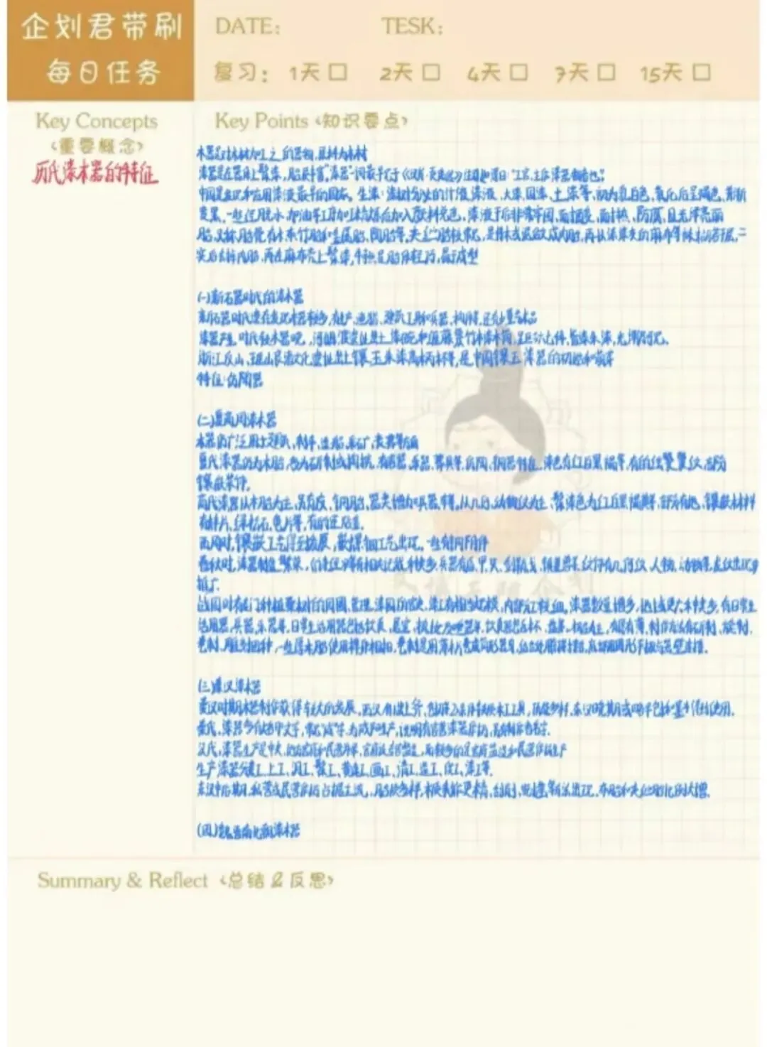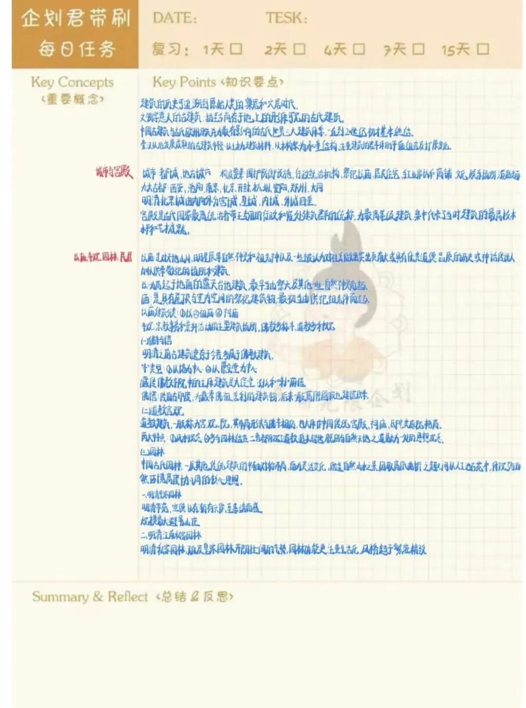 采用康奈尔笔记法,每日完成1张知识卡片,精准记录要点,实现知识浓缩“读薄”,方便查阅回顾。