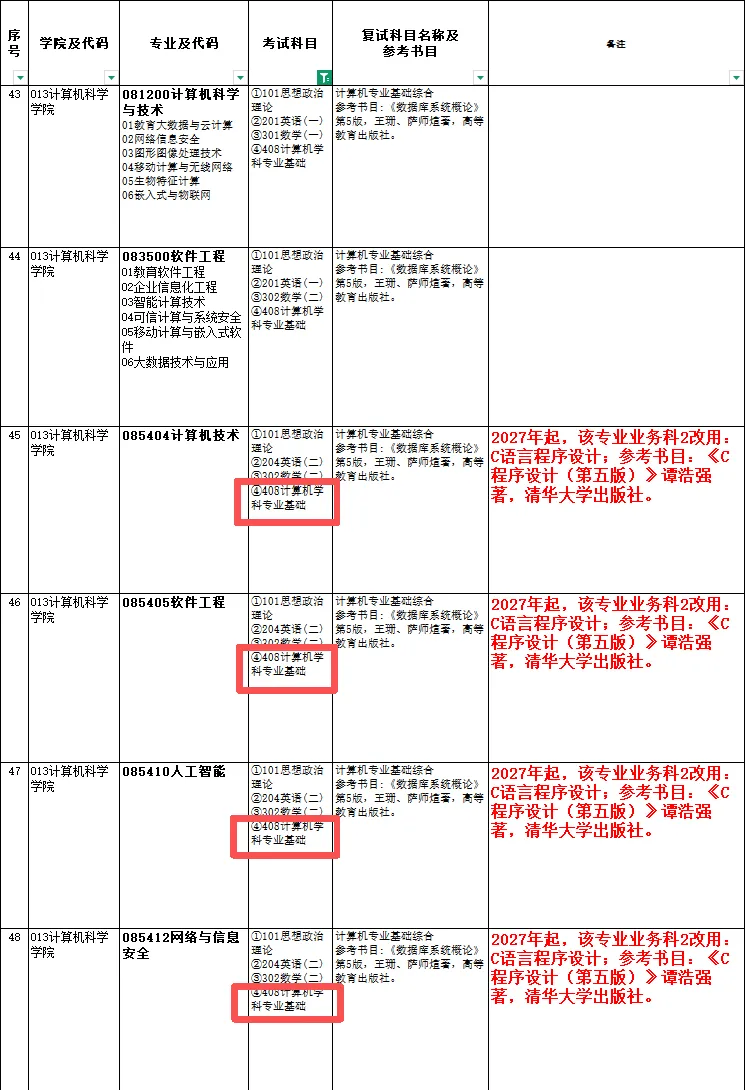 2027年起,计算机科学学院085404计算机技术、085405软件工程、085410人工智能、085412网络与信息安全四个专业科2从408统考改用:C语言程序设计。参考书目:《C程序设计(第五版)》谭浩强著,清华大学出版社。