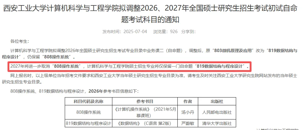 2025年7月4日,西安工业大学计算机科学与工程学院发布26改考通知时一并通知了27改考:2027年将进一步取消“808操作系统”,计算机科学与工程学院硕士招生专业将仅保留一门自命题“819数据结构与程序设计”。