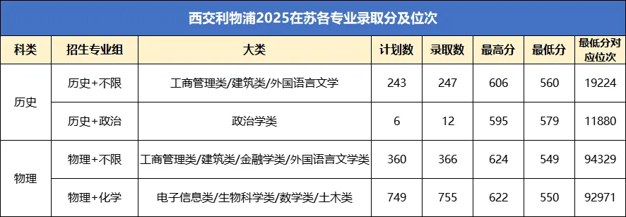 西浦2025年江苏各专业组录取分
