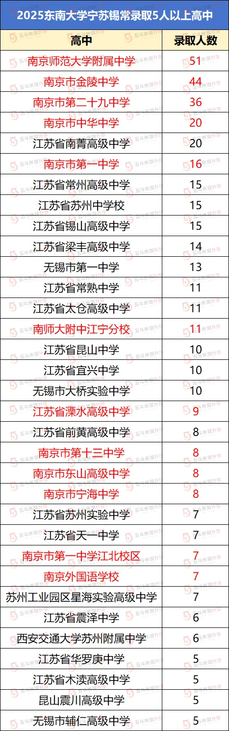 据统计,2025年东大在南京、苏州、无锡、常州录取5人以上高中中,南师附中、金陵中学、二十九中排名前3,南师附中录取人数最多,共计51人。