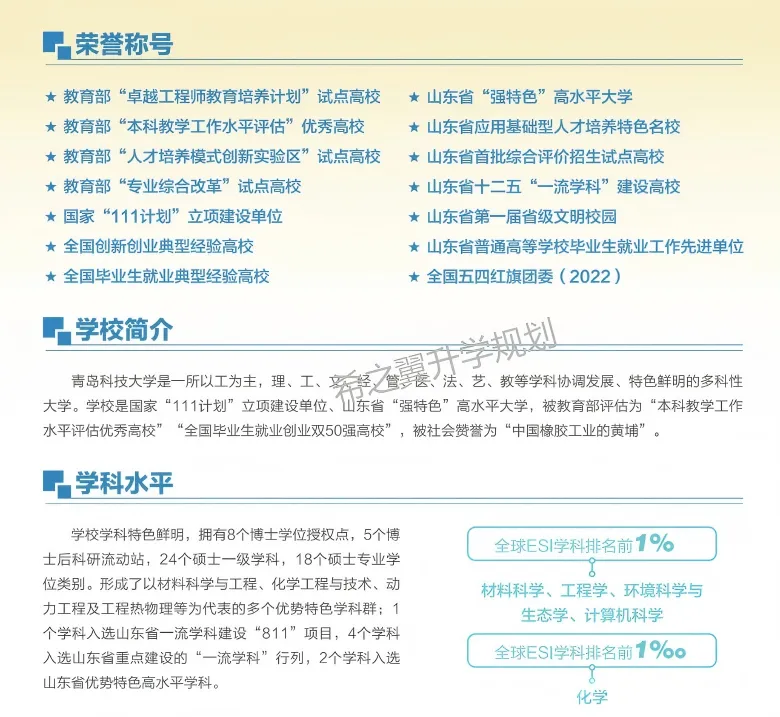 青岛科技大学是一所以工为主,理、工、文、经、管、医、法、艺、教等学科协调发展、特色鲜明的多科性大学。学校是国家“111计划”立项建设单位、山东省“强特色”高水平大学,被教育部评估为“本科教学工作水平评估优秀高校”“全国毕业生就业创业双50强高校”,被社会赞誉为“中国橡胶工业的黄埔”。