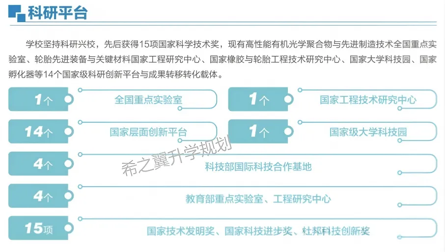 学校坚持科研兴校,先后获得15项国家科学技术奖,现有高性能有机光学聚合物与先进制造技术全国重点实验室、轮胎先进装备与关键材料国家工程研究中心、国家橡胶与轮胎工程技术研究中心、国家大学科技园、国家孵化器等14个国家级科研创新平台与成果转移转化载体。学校国家自然科学基金获批数量逐年增加,近3年累计获批208项。通过科研成果转化培育或提供核心技术支撑而上市的公司已经达到了9家(软控股份有限公司、万华化学集团股份有限公司、赛轮股份有限公司、青岛金王集团、青岛海力威新材料科技股份有限公司、青岛旭域土工材料股份有限公司、青岛高校信息产业股份有限公司、青岛海泰科模塑科技股份有限公司、济南恒誉环保科技股份有限公司)。