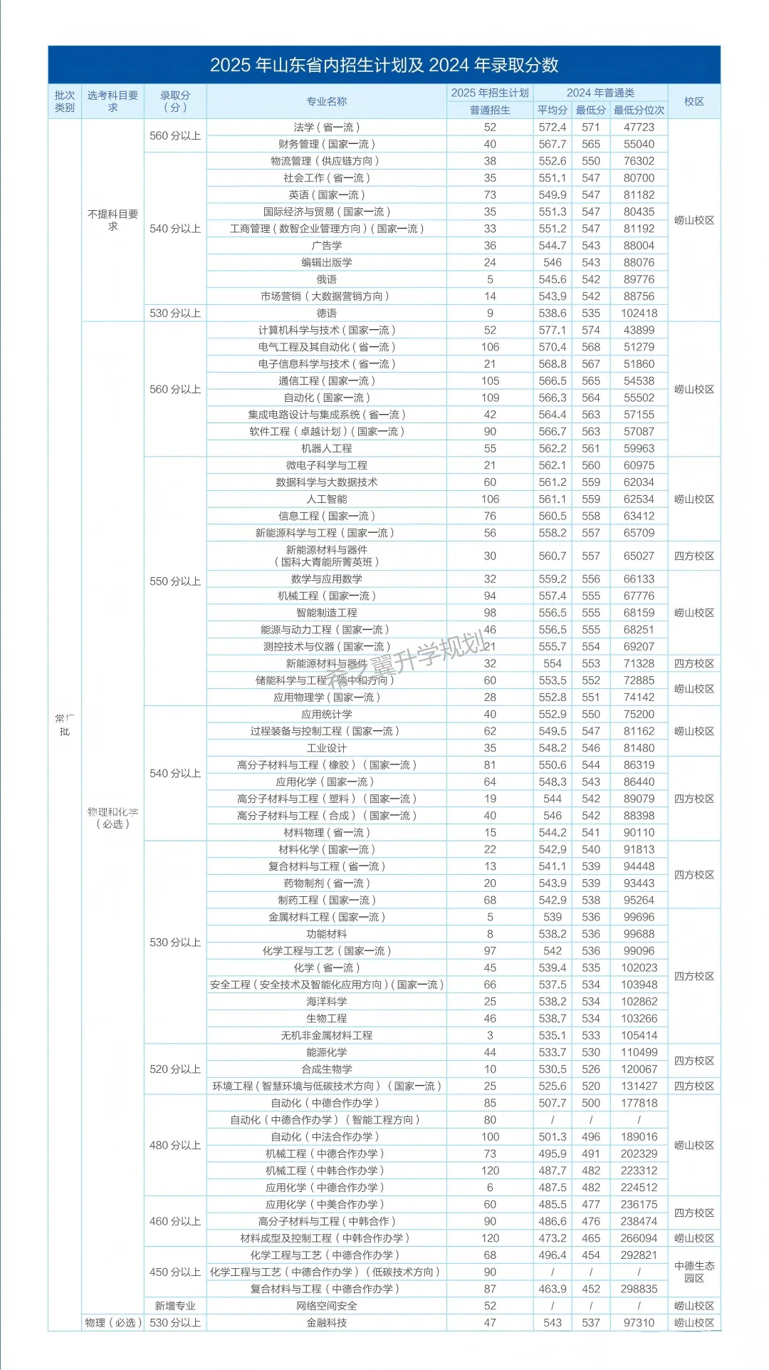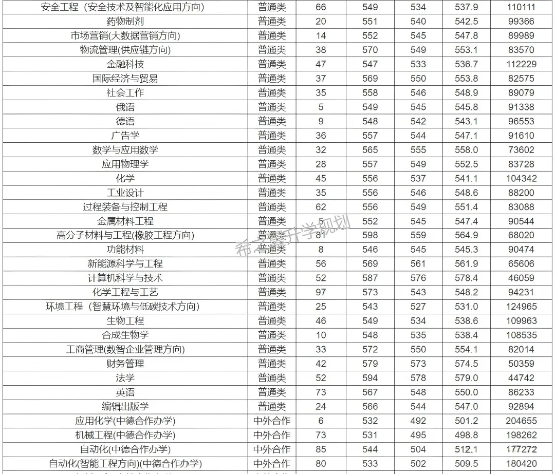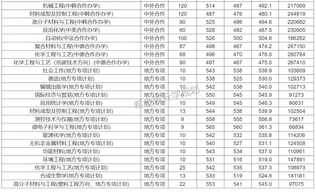 3. 中外合作办学投档位次较2024年全面提升,其中材料成型及控制工程(中韩合作)提升2.1万余名,中德生态园区化学工程与工艺和复合材料与工程提升3万余名。