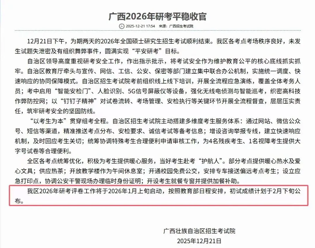 广西已启动1月上旬评卷工作,明确成绩计划2月下旬公布;官网链接:https://www.gxeea.cn/view/content_722_32372.htm