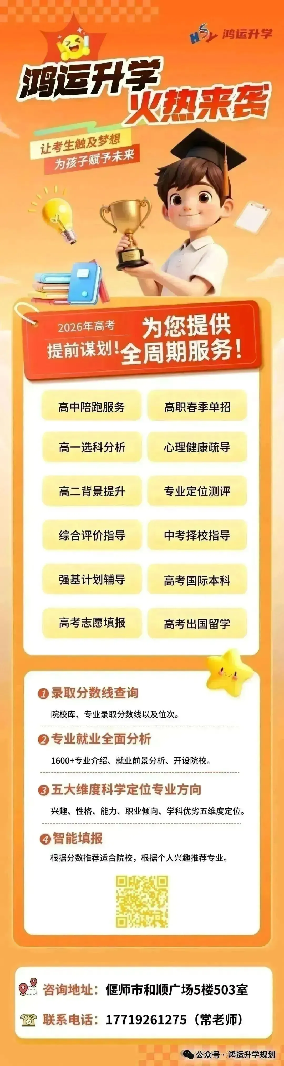 二模成绩已公布,想要咨询孩子二测成绩换算排位的,提前了解相关升学资讯,布局升学路线?识别二维码线上预约,线下免费咨询!鸿运升学规划提供一手综评/强基/港澳/专项/名校升学、学科竞赛、高考选科、志愿填报、生涯规划资讯及解读,欢迎分享推荐给身边的家长和学生,让更多人受益!