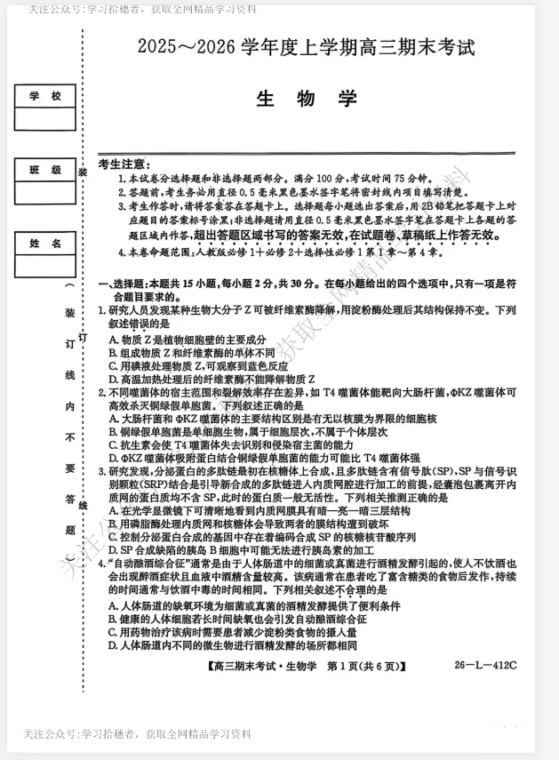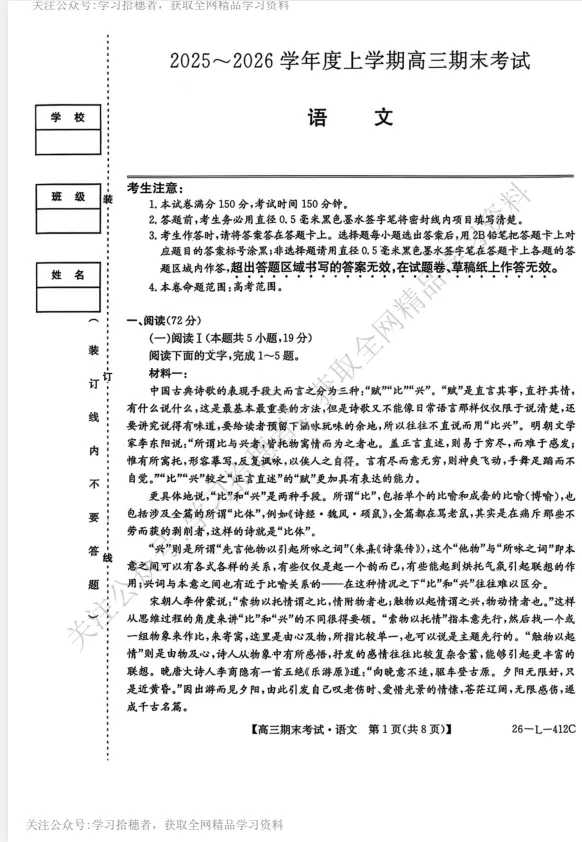 【黑龙江卷】【齐齐哈尔期末】【1月期末考试】黑龙江省齐齐哈尔市2026届高三上学期1月期末(26-L-412C)