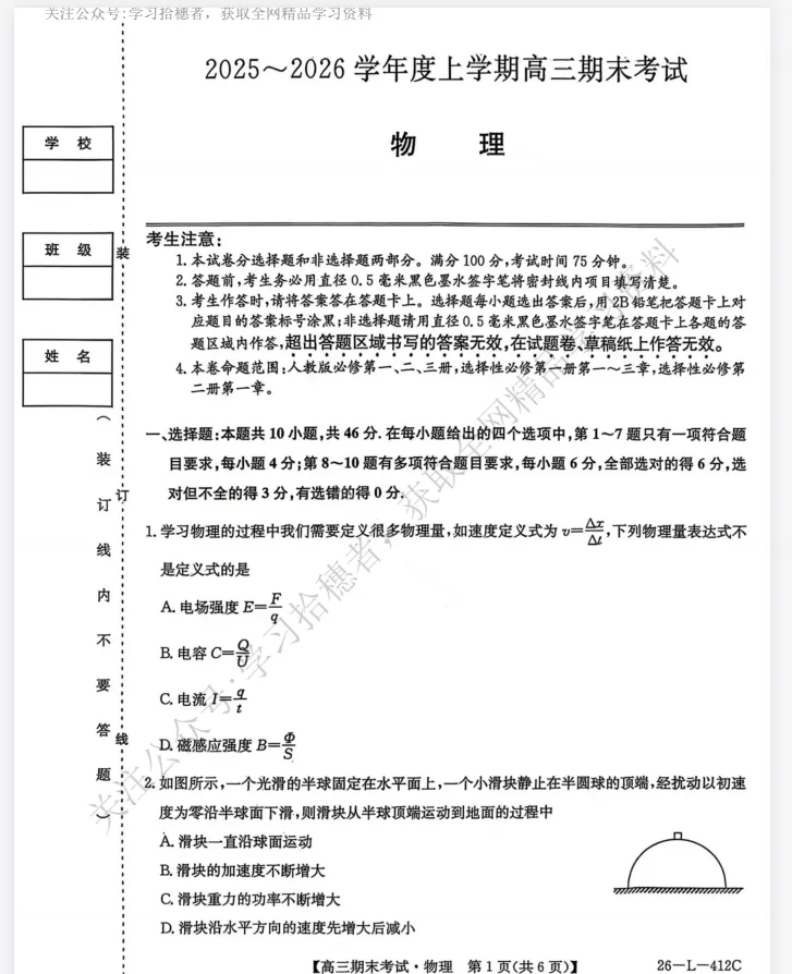 2026年元月高三素质检测考试(安徽六校联考)物理试卷和答案
