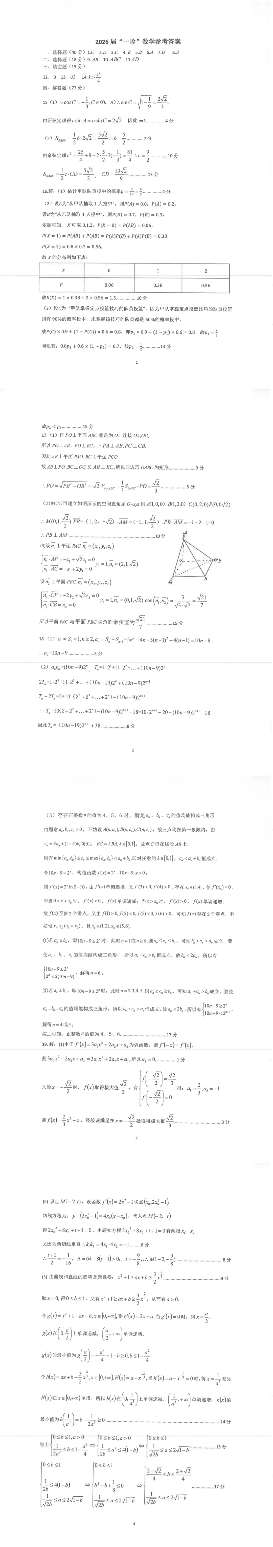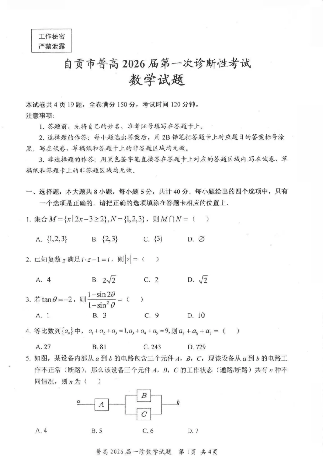 >四川省自贡市2026届高三第一次诊断性考试数学试题