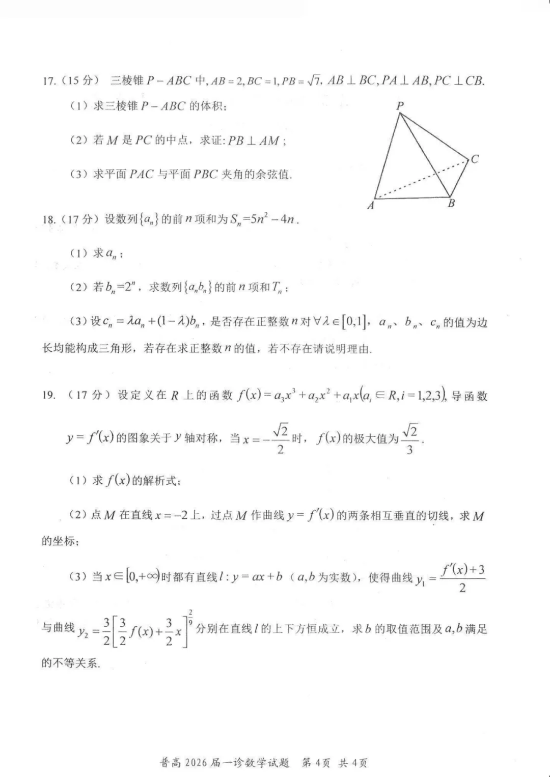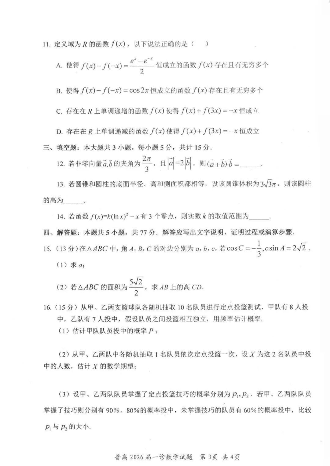 四川省自贡市2026届高三第一次诊断性考试数学试题