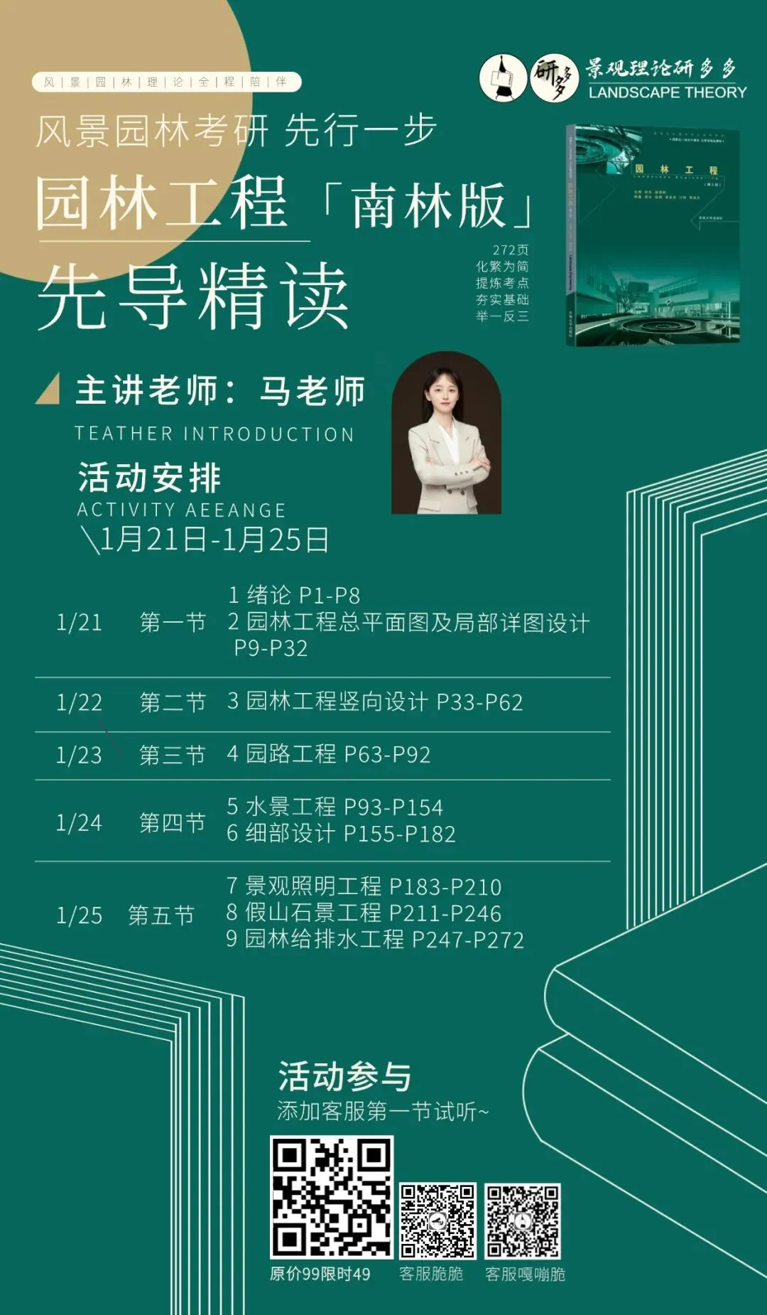 此次活动课针对南林考研理论,选取《园林工程》这本知识点密集,阅读较有难度的书,五天时间,帮助大家从繁琐信息中提炼出考点,整理成一套适合自己的笔记或思维导图,为之后的理论学习打下夯实的基础!