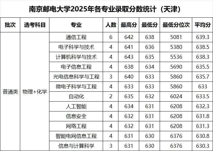 贝尔英才学院竞争最为激烈,四个核心专业最低分均超637分,通信工程最低640分(位次7530)、电子科学与技术最低639分(位次7929)、计算机科学与技术最低638分(位次8363)、人工智能最低637分(位次8838)。普通本科批物理+化学组合热门专业中,通信工程最低623分(位次16880),计算机科学与技术、电子科学与技术、电子信息工程均为618分(位次19675)。