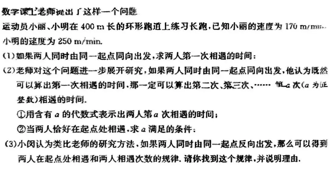 - 两人相遇时,小丽跑了米,当且仅当是的整数倍时,两人恰好是在起点处相遇。。和互素,要使为整数,可知正整数必须为的倍数。当且仅当正整数是的倍数时,两人恰好在起点处相遇。