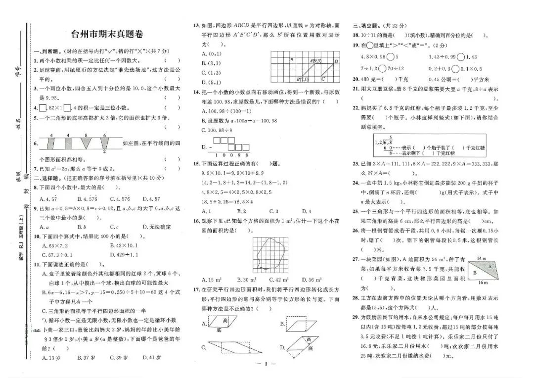 >25秋五年级上册人教版数学《各地期末考试真题检测卷》共14套(附答案)高清电子版可打印