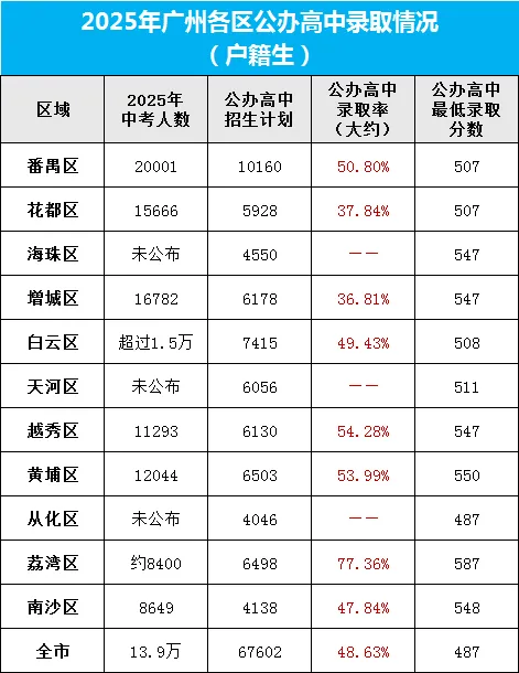 荔湾区公办高中户籍生最低录取分数为587分,居11区首位。同时公办高中录取率方面,增城区录取率36.81%,为各区最低。