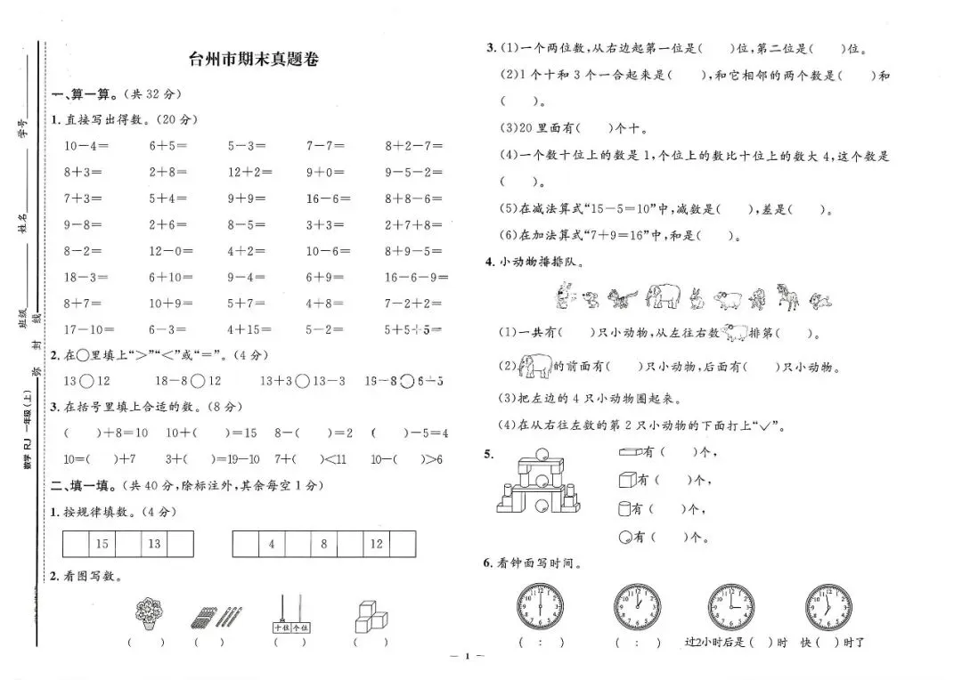 >25秋一年级上册人教版数学《各地期末考试真题检测卷》共14套(附答案)高清电子版可打印