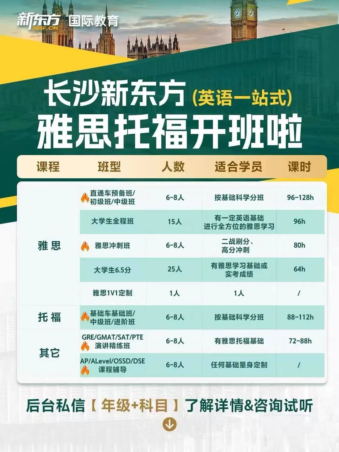 针对不同需求,长沙新东方国际教育提供多种有针对性的课程服务,包括雅思、托福、GRE、GMAT、AP、A-Level、OSSD、SAT、ACT等。