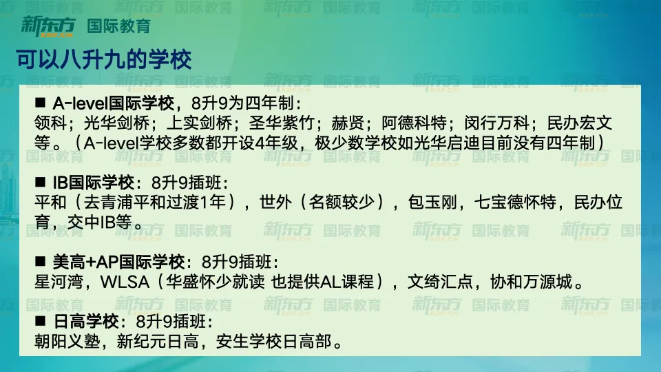 上海多数A-Level学校(如领科、光剑、上实剑桥、圣华紫竹、赫贤、阿德科特、万科等)和部分IB/AP学校(如平和、世外、包玉刚、星河湾、WLSA)都开设“四年制”高中(即从九年级开始)。
