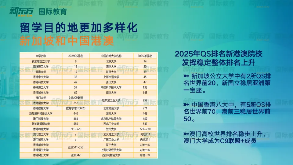 马老师特别强调了新加坡、中国香港方向的升温。从最新排名数据来看,新加坡国立、南洋理工稳居QS前20;香港大学、中文大学、科技大学稳居前50;且这些地区具有 “安全、距离近、学制短、就业好” 的叠加优势。