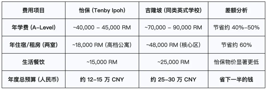 表 1.1:怡保留学 vs. 吉隆坡留学 成本对比模型(预估)