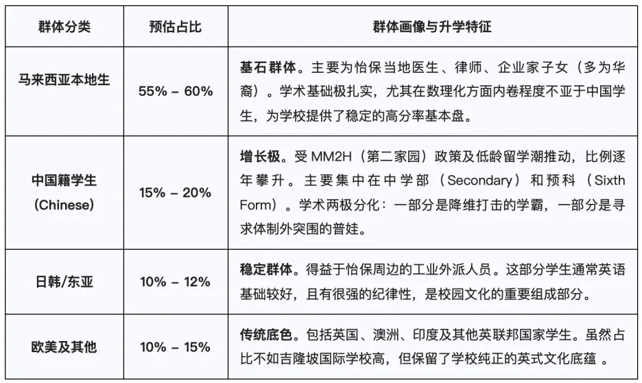 要理解升学成绩,首先必须理解“生源”。一所学校的升学上限往往由生源质量、家庭重视程度以及学校的加工能力共同决定。Tenby Ipoh作为Perak最老牌的国际学校,其生源结构在过去5年发生了微妙而深刻的变化。