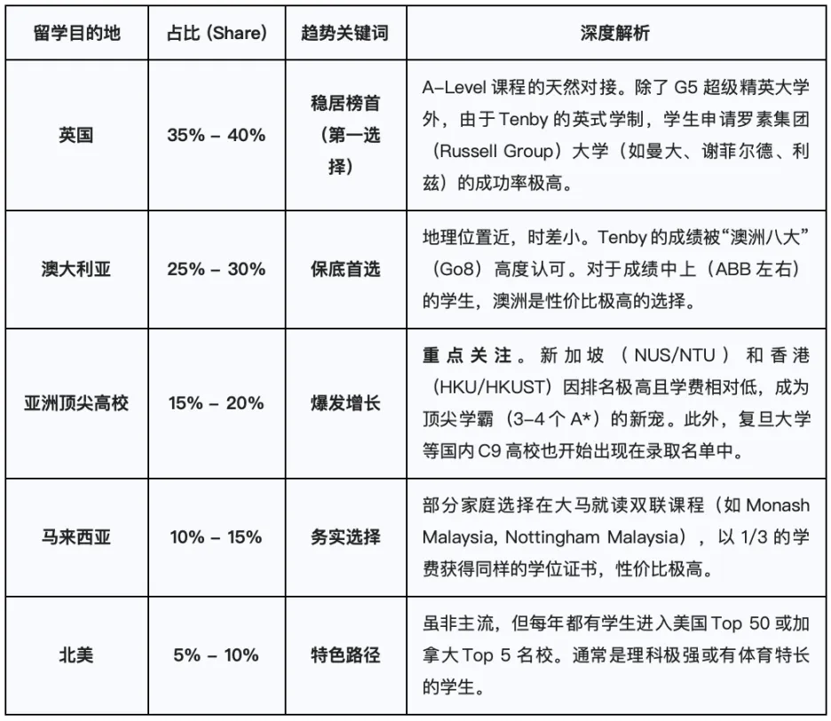 我们整合了Tenby Schools Ipoh官网发布的录取榜单、ISP集团的全球汇报以及公开信息,绘制出了近5年的升学版图,一幅典型的“英联邦主导,多元开花”的画卷。一个显著的趋势是:从“独尊英澳”走向“全球开花”,且“回流亚洲顶尖名校”的趋势日益明显。但如果我们把镜头拉近,会发现中国学生的升学路径与本地学生截然不同。