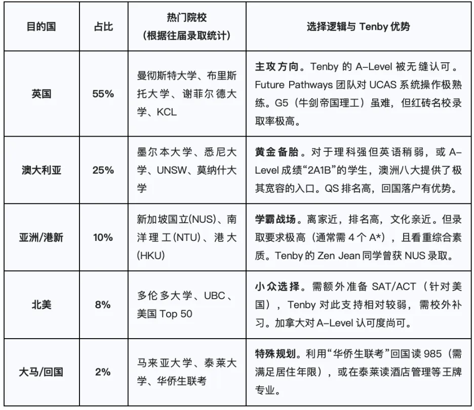 根据对历年榜单中拼音姓名的追踪分析(及与校方发布的Top Scorer名单比对),我们勾勒出了Tenby Ipoh中国留学生的三条典型出路。