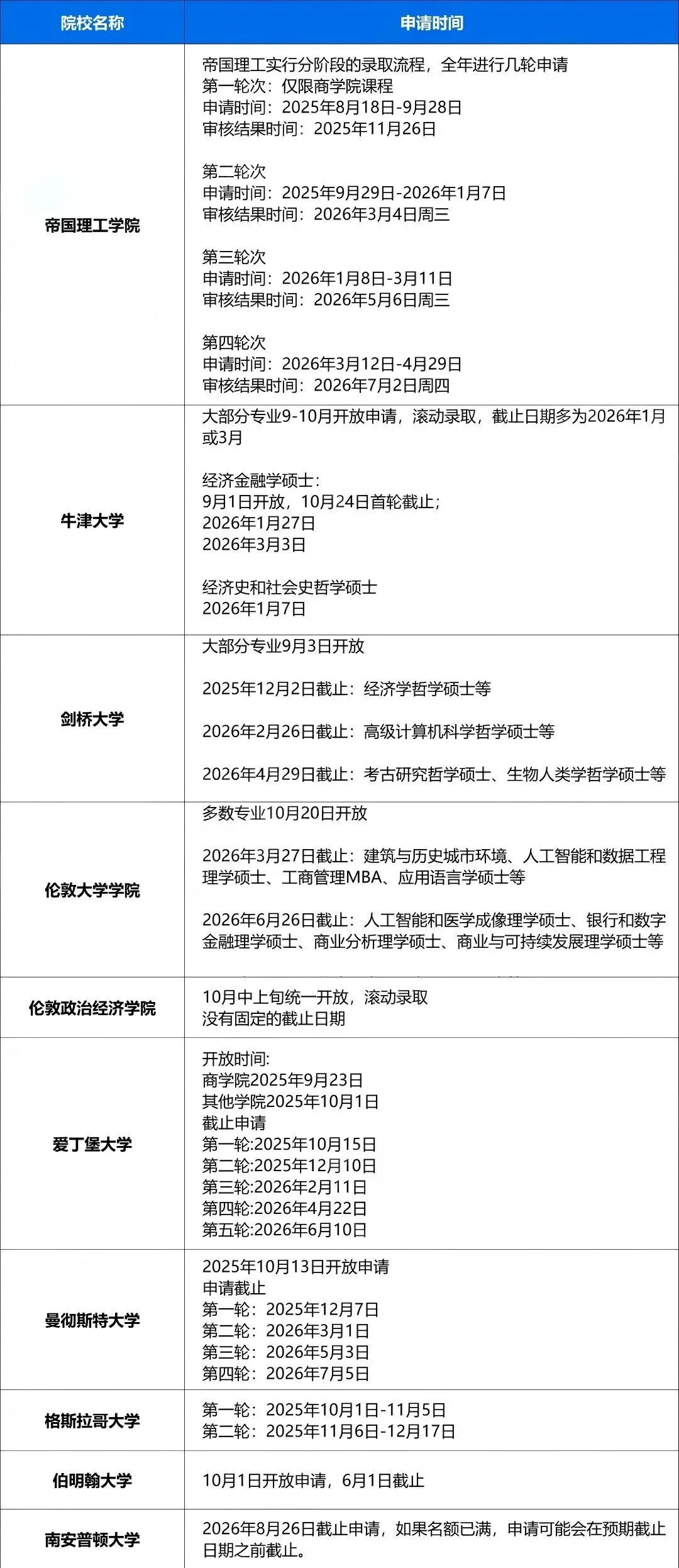 英国硕士申请没有统一截止日期,各院校、专业多采用 “轮次录取” 或 “滚动录取” 模式,热门专业常提前满位,精准把握时间是录取关键。以下是部分顶尖院校及热门院校的核心时间节点,供你参考: