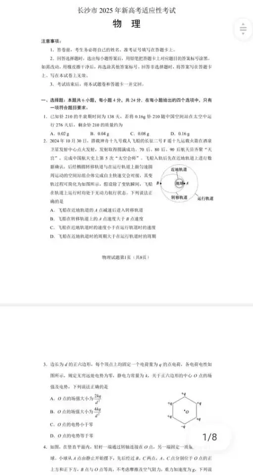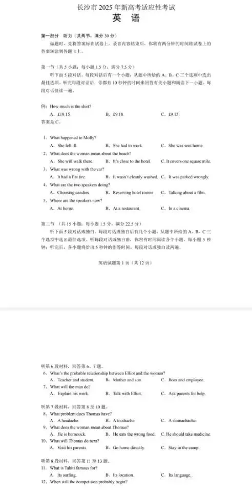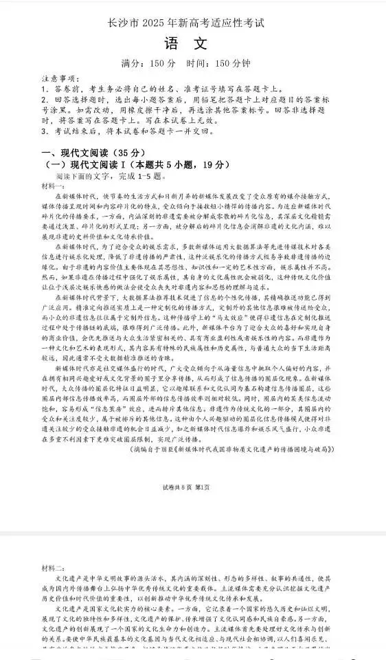 长沙市2025年高三适应性考试(全科)