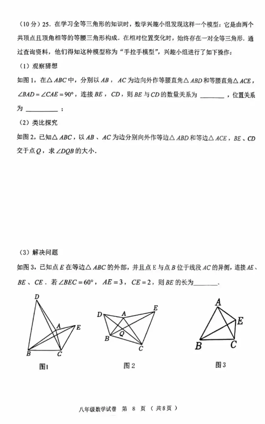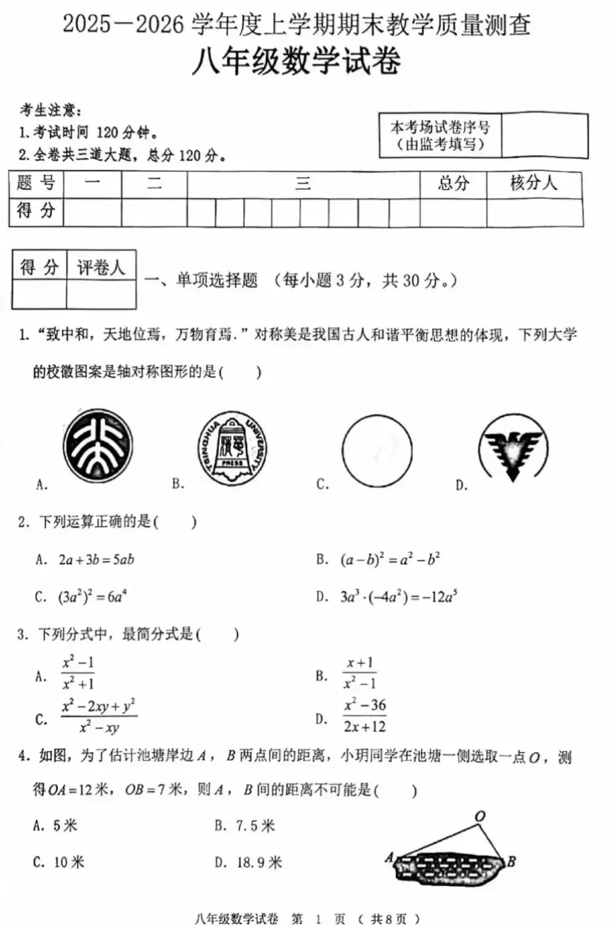 2025~2026八年级上册数学期末考试试题+答案