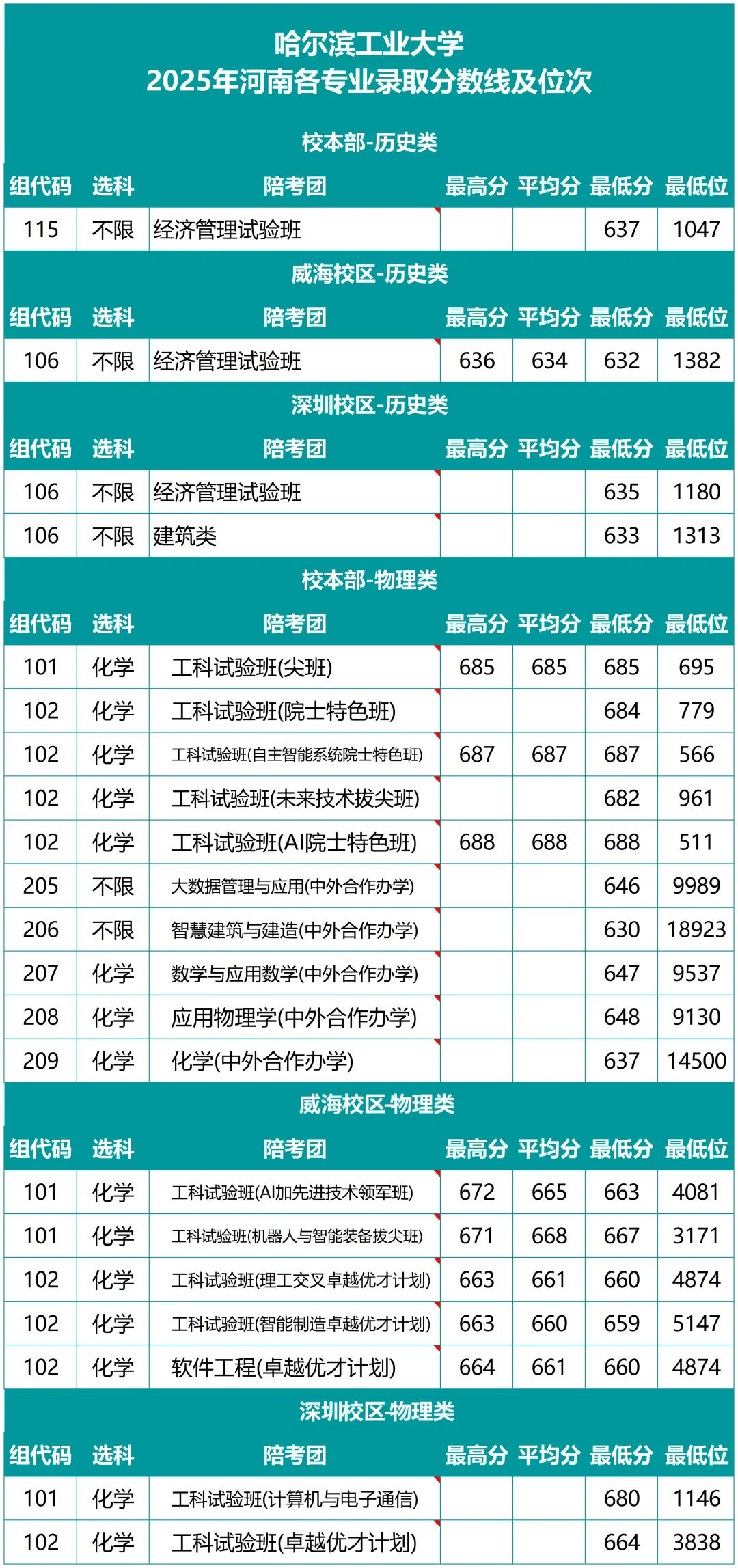 哈尔滨工业大学2025年河南各专业录取分数线及位次