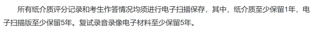 试卷和复试材料的保存期限显著延长,电子扫描版答卷和复试录音录像电子材料的保存时间从3年延长至5年。