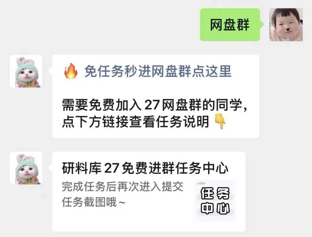 公众号研料库后台回复:网盘群,并按照要求发布推荐评论、海报、小红书帖文宣传公众号,完成任务后上传截图,管理员审核通过后即可免费进入27考研网盘群。✅