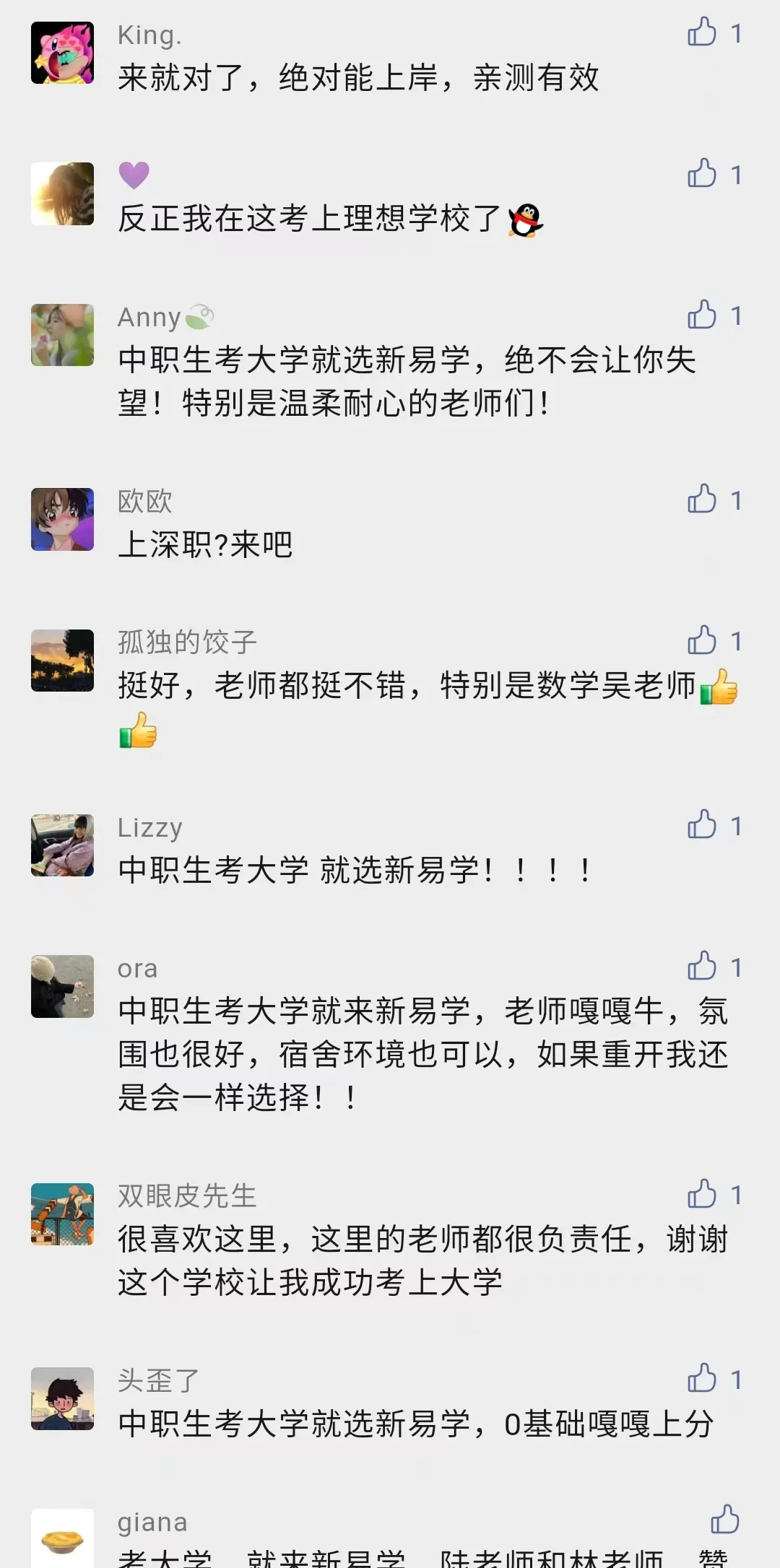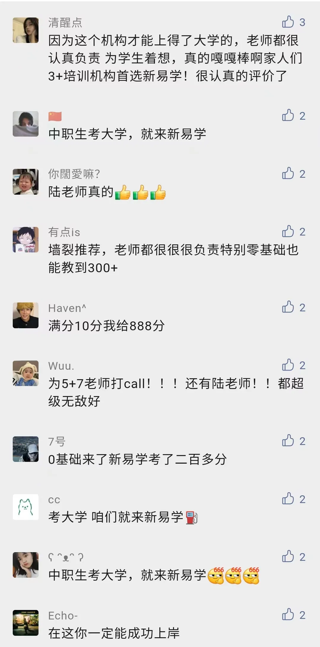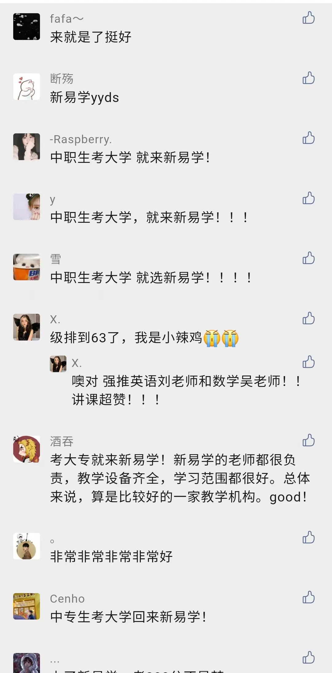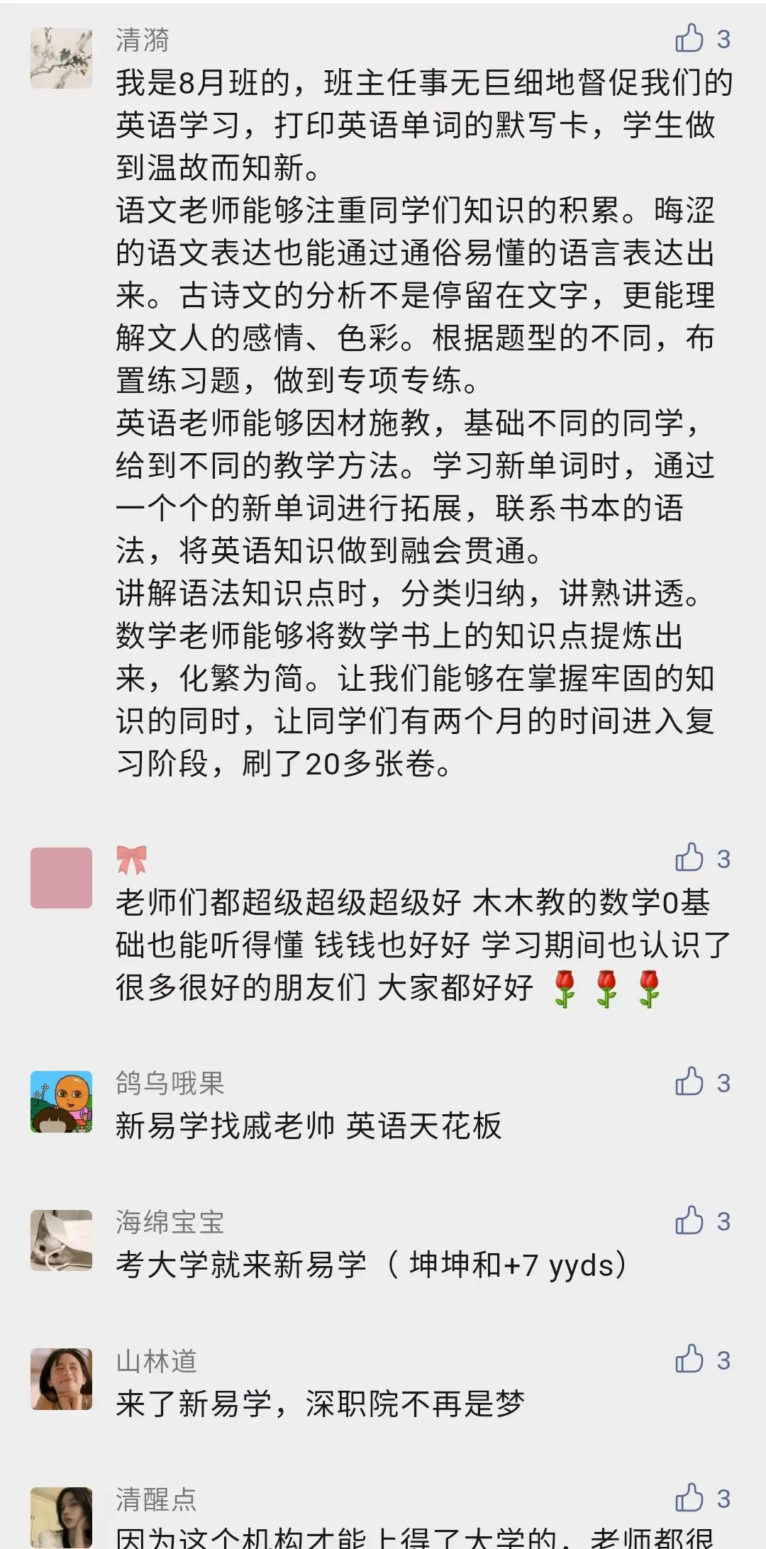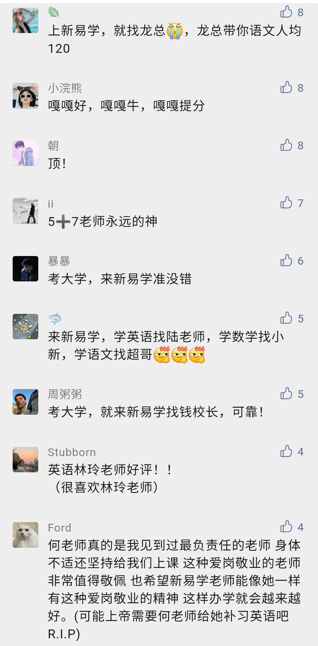 多年来,用心服务学生,始终坚持“一切从学生中来,一切从学生中去”的教育经营原则。新易学教育的教学成果与服务获得了学生的一致肯定。