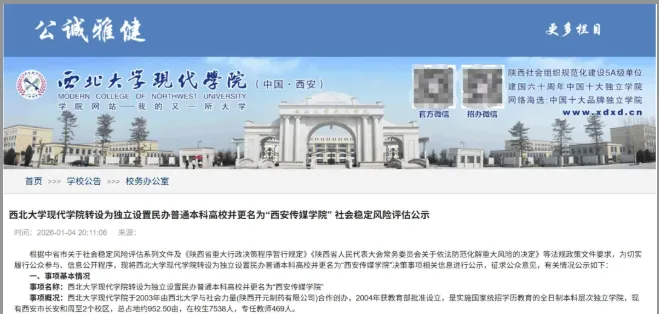 近日,西北大学现代学院官网发布《西北大学现代学院转设为独立设置民办普通本科高校并更名为“西安传媒学院” 社会稳定风险评估公示》。